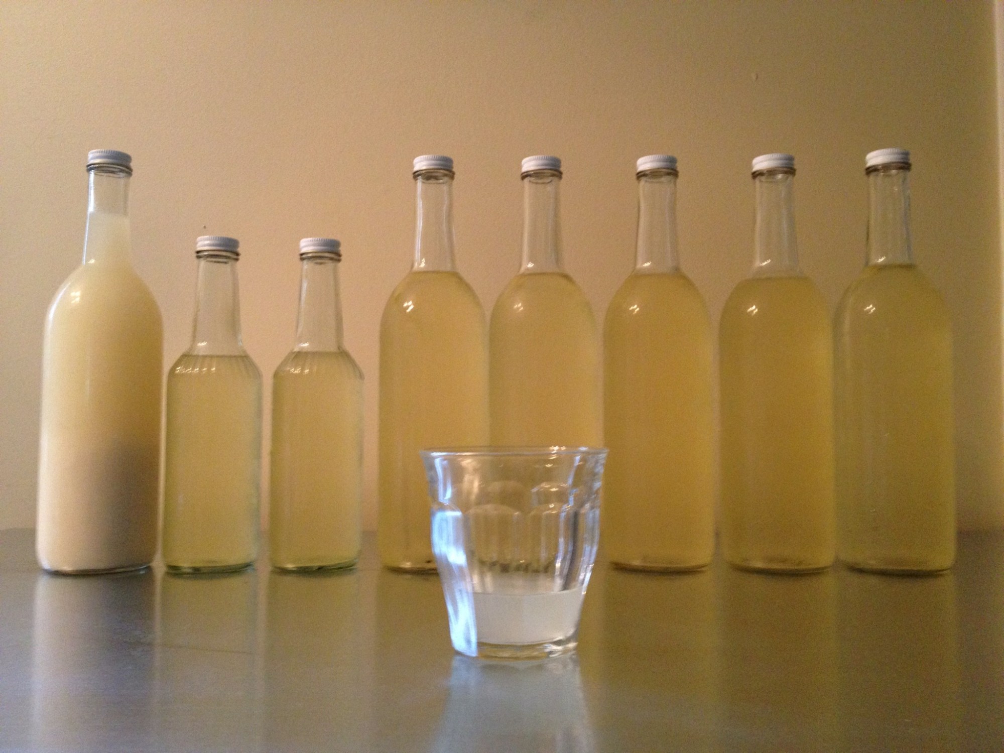 One week from the pressing day. As sedimentation settles, clear Sake is bottled into 750ml and 375ml bottles. The 750ml bottle is almost equivalent to the 4-Go bottle, a typical dinner size Sake bottle in Japan. The milky sediment part is separated as Nigori Sake, which is more popular in the US than in Japan. Now it’s time to start designing the label for our first batch.