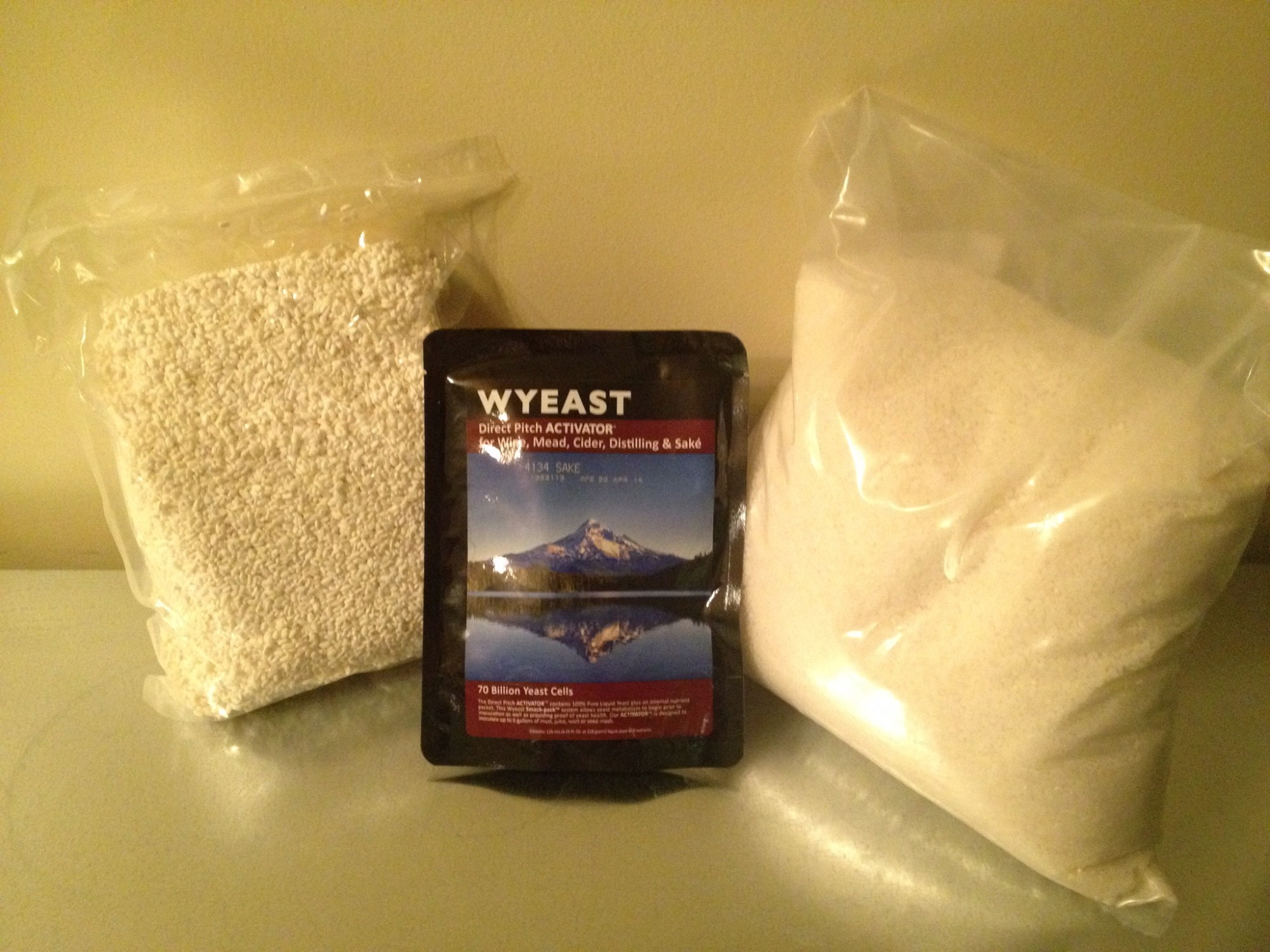 Just received ingredients for the second batch from Home Brew Sake. From left, 40oz of Koji [麹], Sake yeast [酒酵母], and 10 lbs of 60%-polished rice [酒造米]. These (+ water) are the main ingredients for about 2 gallons of Sake.