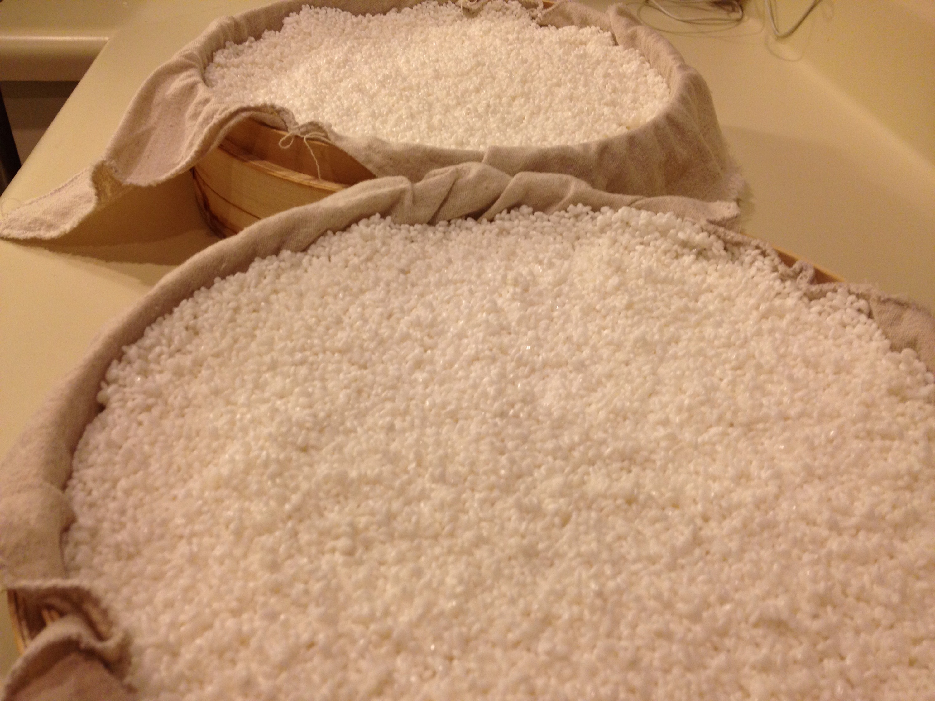 Just completed the final addition of the three-step mash build-up process, or Sandan Jikomi [三段仕込み]. The last addition is called Tomezoe [留添え], which concludes the preparation of the main mash, or Moromi [醪]. From here, the main fermentation starts in the 5-gal glass jar, where Koji mold [麹菌] transforms the rice into sugar, which is then converted to alcohol by yeast [酵母]. Batch #3 Sake South will be ready in a month.