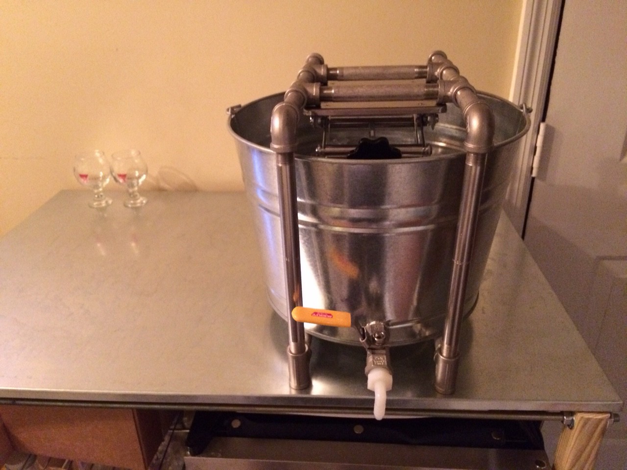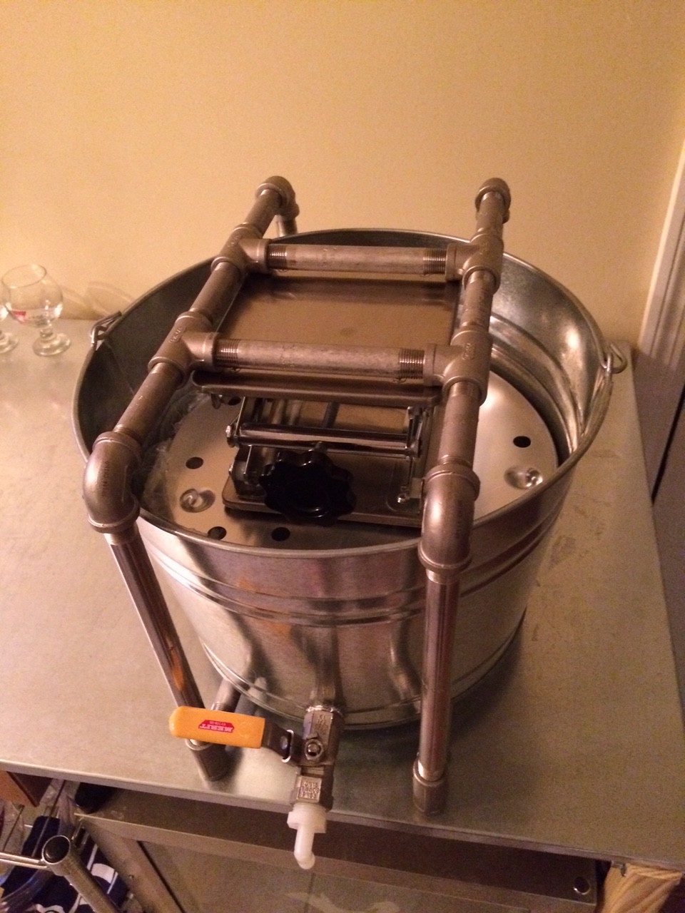 Our upgraded pressing machine uses a lab scissor jack for the pressure. It’s small enough to be used in the refrigerator so we can keep the mash and Sake chilled during the pressing to prevent it from spoiled.