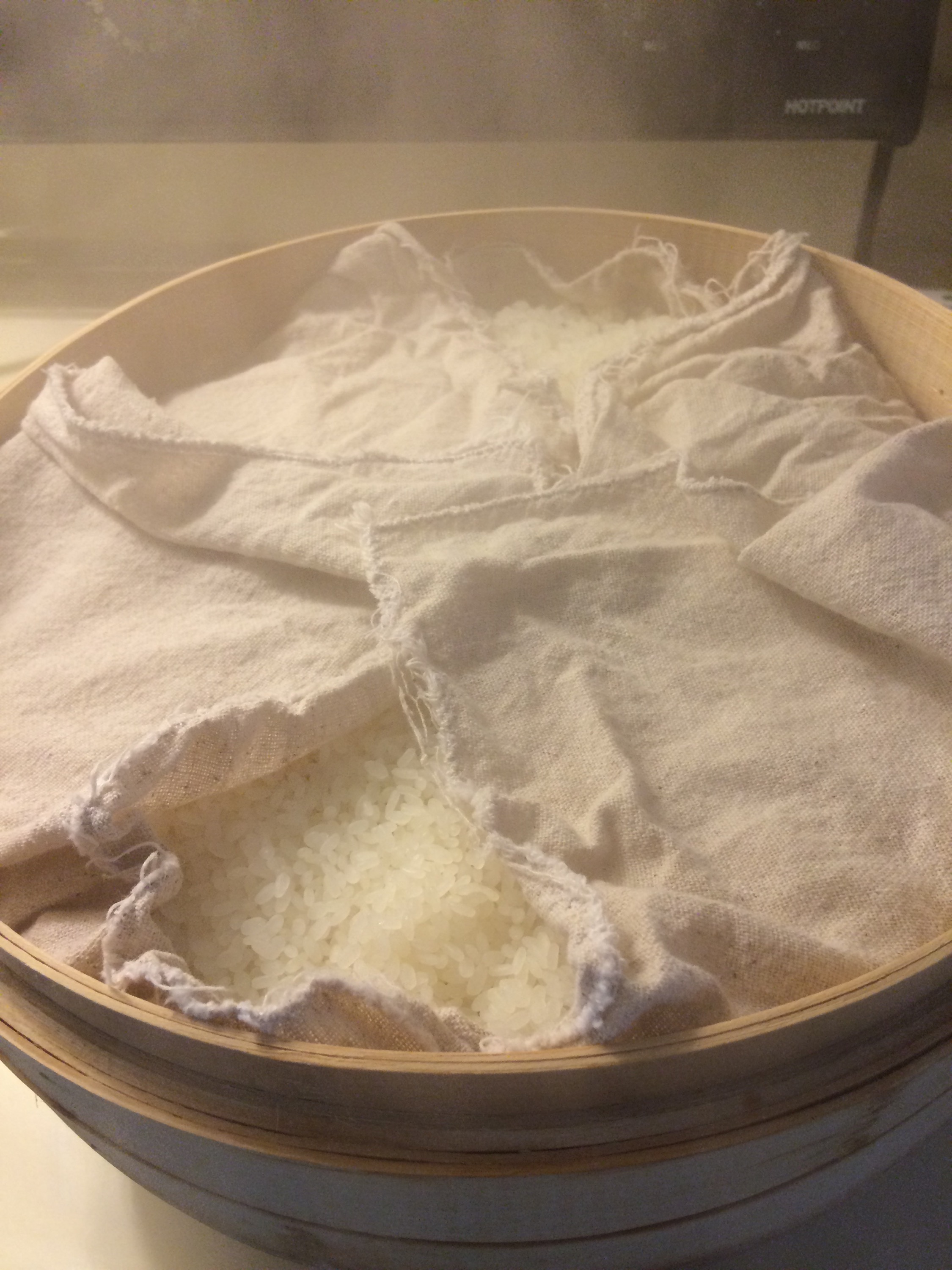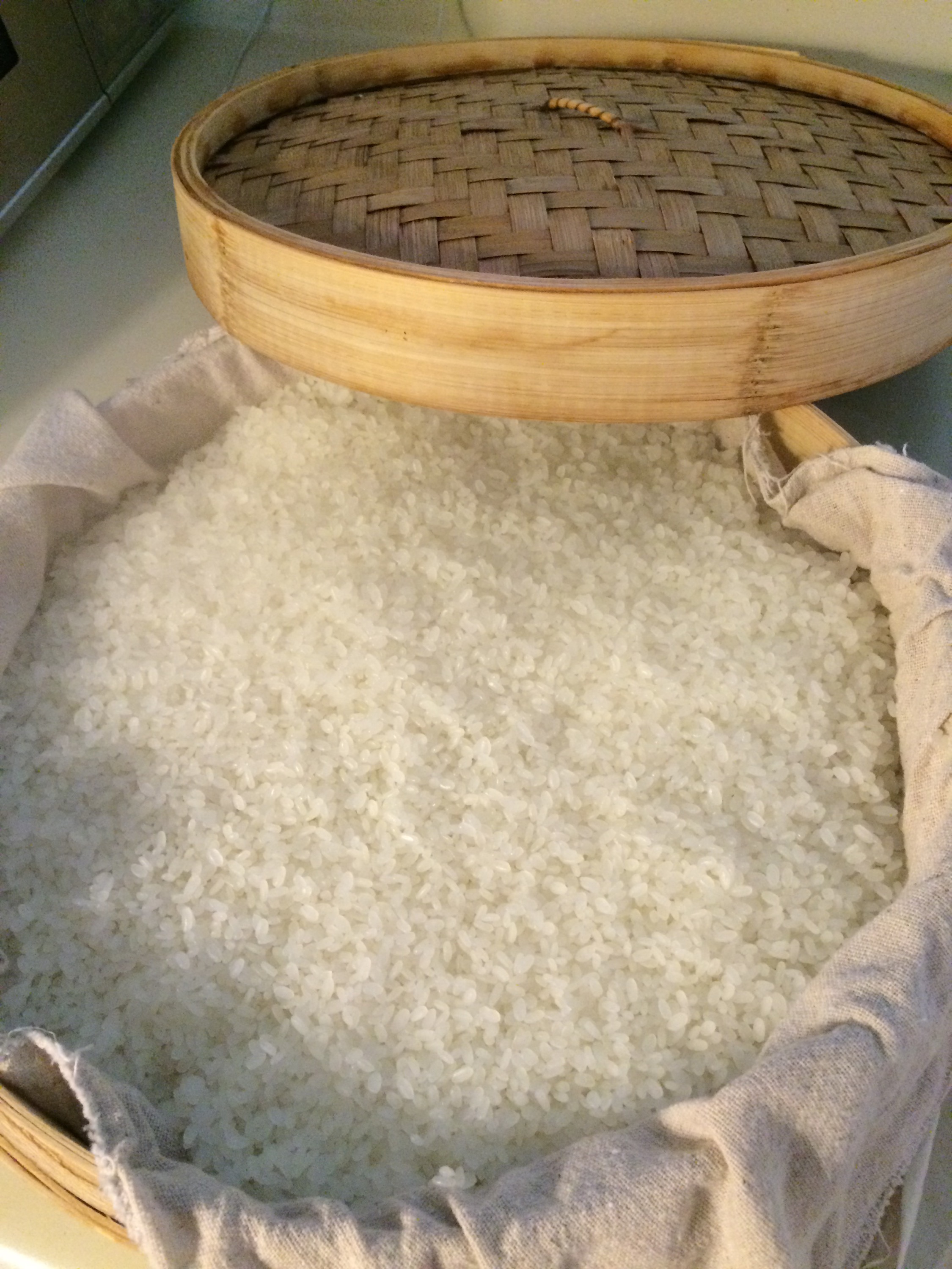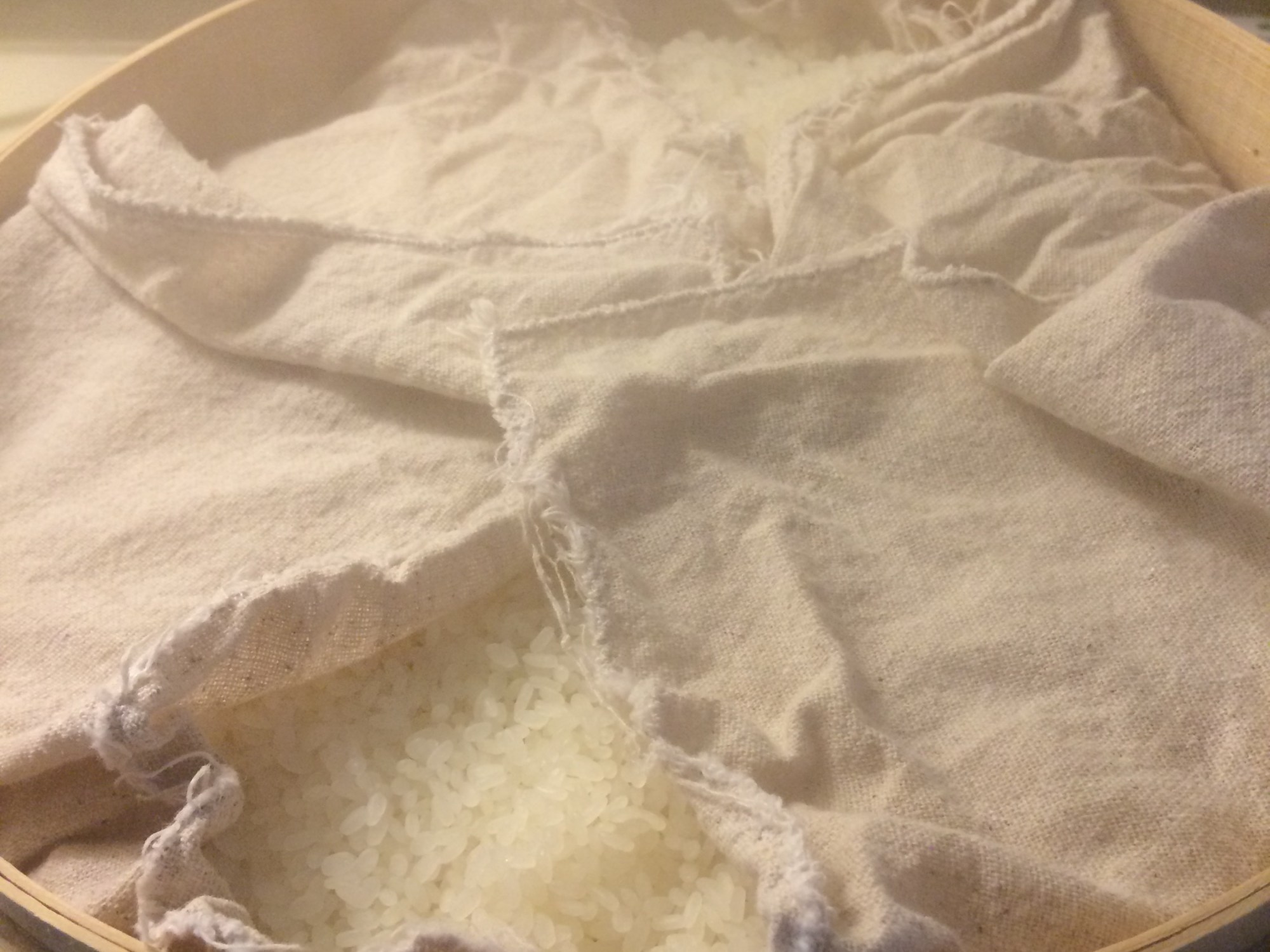 Building up the main mash, or Moromi [醪]. Today is the first addition called Hatsuzoe [初添え]. Water, Koji, and steamed rice was added to the starter, or Moto. We’ll add more on Day 8 and 9 to build the mash up to the final volume. This three step build-up is called Sandan-Jikomi [三段仕込み], a traditional wisdom of making healthy mash.