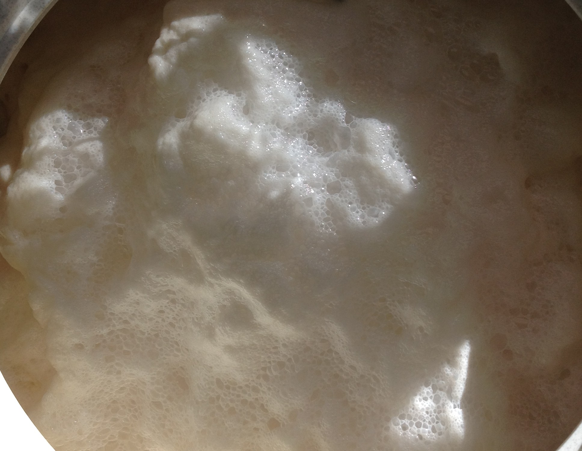 Batch #7 has been very active for the past two days, producing high foam [高泡], although we used a “foamless” yeast strain [泡なし酵母]. The amount of foam is much less than its foaming sisters but is enough to overflow from the fermentor sometimes. This is the first time we used “foamless” yeast and we are still learning.